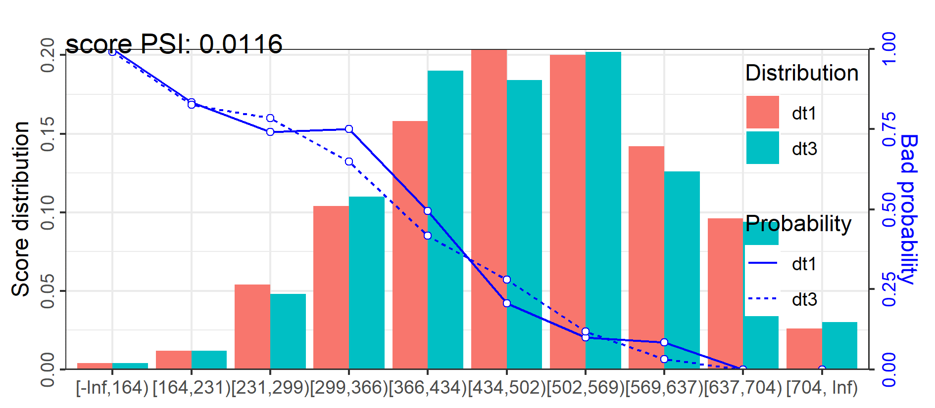 • Comparison of distributions of training data (data used to develop the model) to a scoring variable (predicted probability)