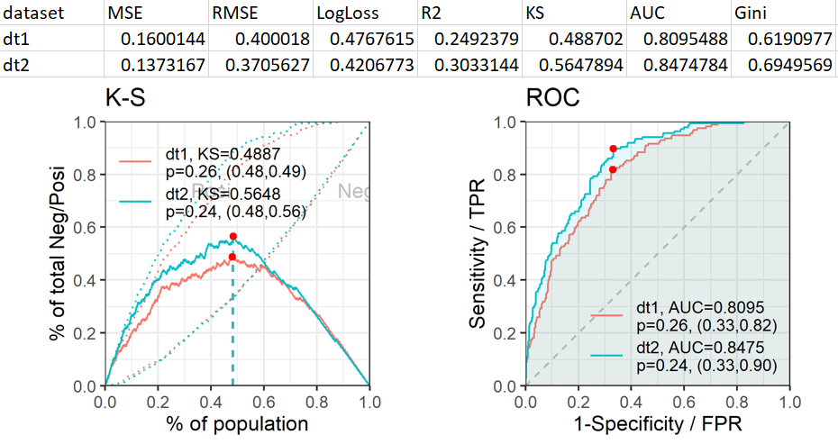 • The size of the area indicates how well the model’s scoring does at separating 2 classes (bigger is better).